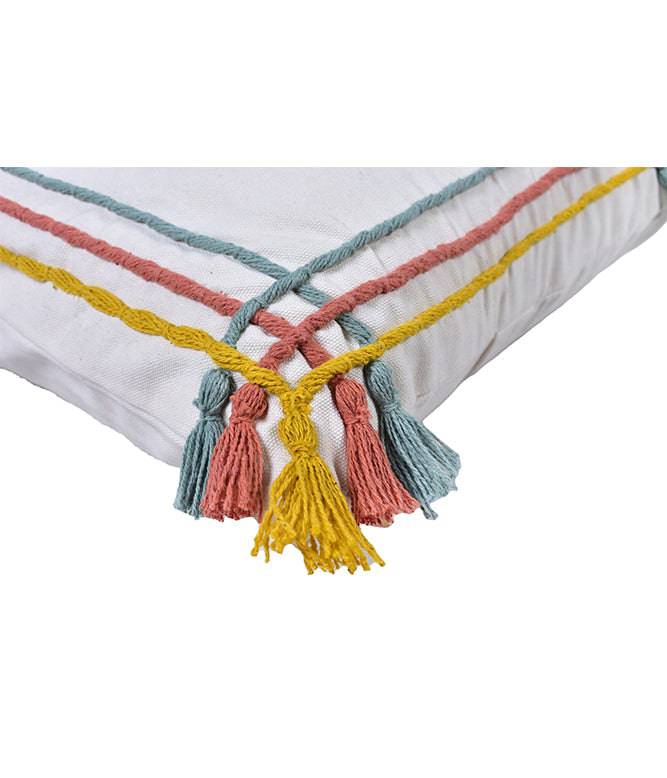 Introducing our exquisite 35×60 cm lumbar cushion cover, meticulously crafted from 100% cotton. This artisanal masterpiece boasts a captivating dori embroidery arrangement that adorns the edges, accompanied by charming tassels that add an elegant touch.