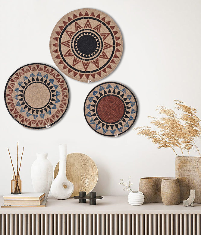 Elevate your space with our captivating Solar Symphony wall art. Inspired by the sun's radiant energy, these circular tapestries feature intricate geometric patterns in rich, earthy tones. Handcrafted with precision, each piece is a unique work of art that adds a touch of warmth and vibrancy to any room..